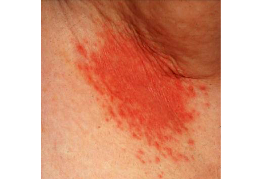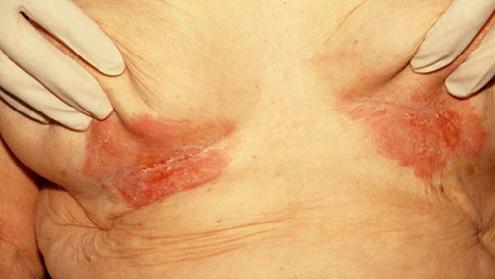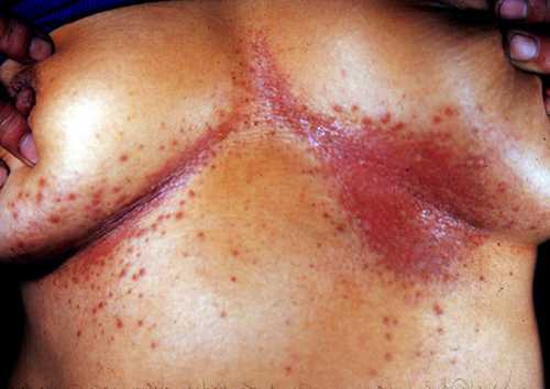 Сначала в складке кожи появляется воспалительная отечная эритема – небольшое покраснение кожи. Потом начинают возникать мокнущие трещины, появление которых сопровождается болью, жжением и зудом.