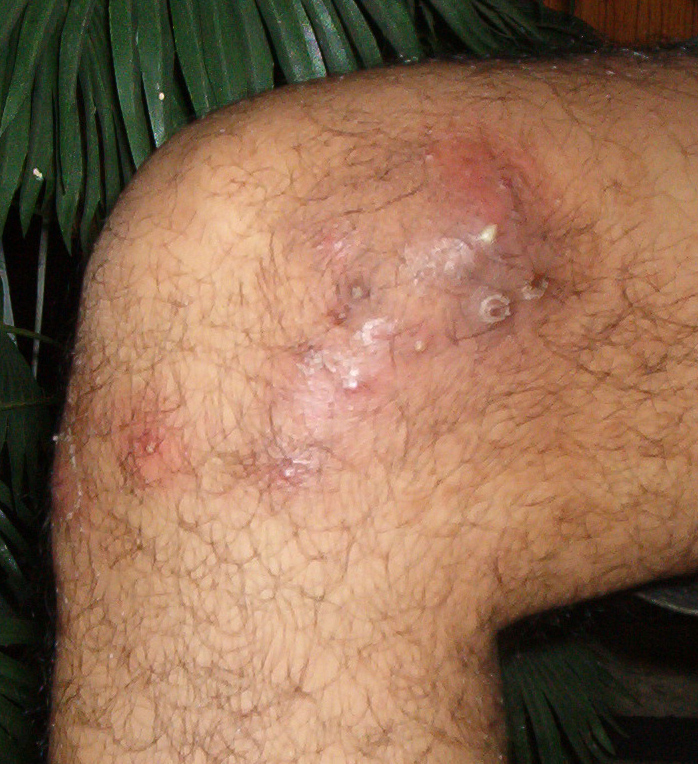 Заболевание начинается появлением на поверхности кожи воспалительного инфильтрата, который быстро увеличивается в размерах. Отмечается резкая боль при надавливании, напряжение тканей и постоянная распирающая боль. Постепенно кожа на месте инфильтрата становится фиолетовой и напряженной, появляется отек. Над очагом некроза в нескольких местах прорывается истонченный эпидермис. Из мест прорыва на поверхность выходит густой гной, а чрез отверстия можно увидеть некротизированные ткани.