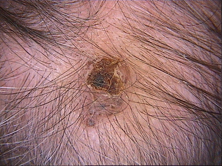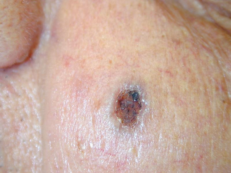 Эта базалиома обычно черная или темно-коричневая. Внешне она иногда выглядит как псориаз, красная волчанка или парапсориаз, но отличить ее можно по мелким узелкам, располагающимся по периферии пораженной области.