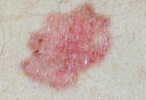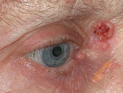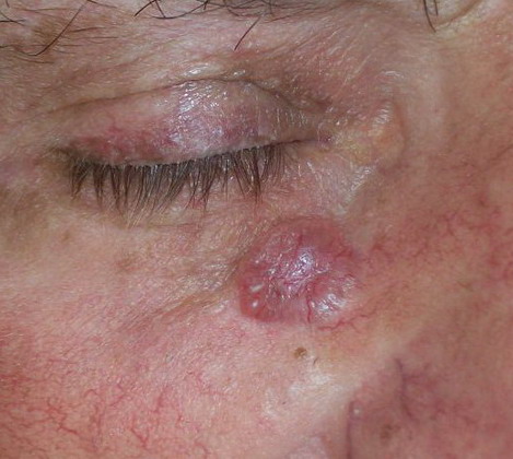Эта базалиома выглядит как несколько очагов с достаточно четкими границами, которые состоят из мелких узелков. В очагах видны корочки, шелушение и инфильтрация. Если корочки удалить, то могут образоваться язвы.